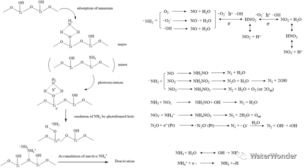 光催化氧化氨氣的機(jī)理主要是當(dāng)氨氣吸附在二氧化鈦表面上。在光的激發(fā)下,半導(dǎo)體產(chǎn)生空穴電子對(duì),空穴可以氧化催化劑表面吸附的氨氣,產(chǎn)生 ?NH2。?NH2可以與O2、?O2-、?OH直接氧化生成NO和NO-,并在活性氧化物種空穴、?O2-和?OH的作用下進(jìn)一步氧化成NO、NO2、NO2-和NO3-等。與此同時(shí),光生電子同樣可以作用吸附在催化劑表面的氮氧化物,將其部分還原。